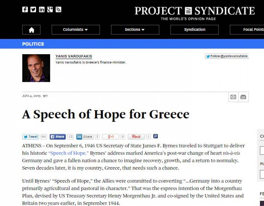 Ο κύριος Βαρουφάκης, στο μακροσκελές άρθρο του, που όπως αναφέρει γράφτηκε την ώρα που ο Αλέξης Τσίπρας και η ελληνική αντιπορσωπεία παρουσίαζε στις Βρυξέλλες την ελληνική πρόταση προς τους δανειστές, συγκρίνει την κατάσταση στην σημερινή Ελλάδα με την Γερμανία του 1945, όταν μόλις είχε συνθηκολογήσει για την λήξη του Β' Παγκοσμίου Πολέμου. Τότε, σημειώνει ο υπουργός Οικονομικών, ο αμερικανός υπουργός Τζέιμς Μπάιρνς εκφώνησε στην Στουτγκάρδη τον «Λόγο της Ελπίδας» προς τους Γερμανούς, που είχαν ανάγκη να ακούσουν πως η διεθνής κοινότητα θα στηρίξει την προσπάθειά τους για ανάκαμψη.