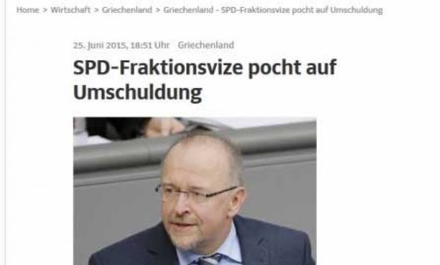Ο πρόεδρος του SPD Ζίγκμαρ Γκάμπριελ είχε δηλώσει προσφάτως ότι δεν έχει νόημα η διαγραφή του χρέους, αν δημιουργηθούν αμέσως μετά ξανά νέα χρέη, προσθέτοντας ότι η Γερμανία και η Ευρώπη δεν εκβιάζονται.
