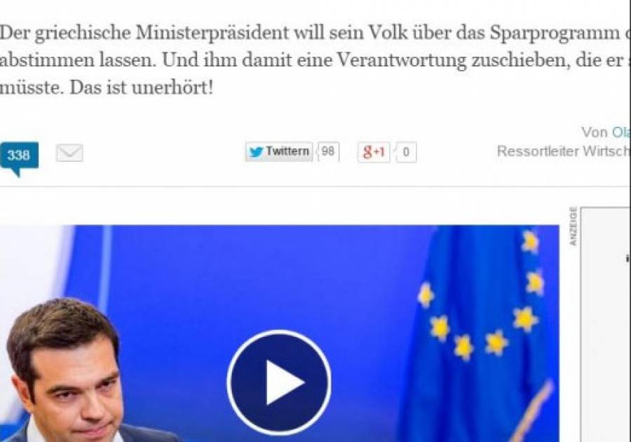 «Δημοψήφισμα για τις προτάσεις των δανειστών ανακοινώνει ο Α. Τσίπρας» (Süddeutsche Zeitung), «Ο Α. Τσίπρας μεταθέτει την ευθύνη στο λαό» (Handelsblatt) «Πως ο Α. Τσίπρας αποκαλύπτεται ως δειλός» (Die Welt), είναι μερικοί ενδεικτικοί τίτλοι γερμανικών εφημερίδων μετά την ανακοίνωση για διεξαγωγή δημοψηφίσματος στην Ελλάδα στις 5 Ιουλίου με αντικείμενο της προτάσεις των δανειστών.