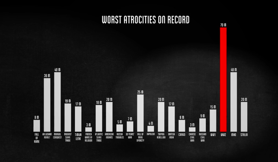 Οι αριθμοί είναι τεράστιοι και συνάμα αποκαλυπτικοί. O Νιλ μας δίνει πολλά στοιχεία, όπως τους πεσόντες ανά χώρα, ανά μέτωπο και ανά χρονική περίοδο, ενώ ταυτόχρονα αναλύει στο 18λεπτο περίπου βίντεο και την θλεση του Β' Παγκόσμιου Πόλεμου σε σχέση με όλους τους μεγάλους πολέμους της ανθρωπότητας.