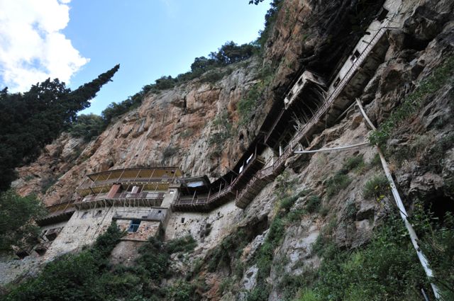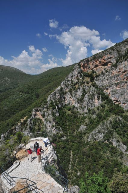 Η πρώτη στάση για λίγες ανάσες πραγματοποιήθηκε στο “μπαλκόνι του Προδρόμου" (600μ), εκεί όπου μας προσφέρεται απλόχερα η πανέμορφη θέα προς το φαράγγι του Λούσιου. Μερικές εκατοντάδες μέτρα παρακάτω έβλεπες ανθρώπινες φιγούρες ακίνητες και τα βλέμματα να στρέφουν προς τα πάνω με τις φωτογραφικές μηχανές ανά χείρας. Σκαρφαλωμένη κυριολεκτικά πάνω σε κάθετο βράχο στο φαράγγι του ποταμού Λούσιου, ή Ιερά Μονή Τιμίου Προδρόμου κόβει την ανάσα στον ανυποψίαστο και πρωτάρη επισκέπτη, προκαλώντας τον θαυμασμό για τον τρόπο με τον οποίο χτίστηκε πάνω στα βράχια. Η Μονή χτίστηκε τον 16ο αιώνα και κατά την Ελληνική Επανάσταση του 1821 διαδραμάτισε καθοριστικό ρόλο στην περίθαλψη και τον ανεφοδιασμό των Ελλήνων αγωνιστών, αλλά και σημαντικό καταφύγιο στον πληθυσμό από τους διωγμούς των Τούρκων. Μου προκαλεί δέος το γεγονός ότι μεγάλοι Έλληνες οπλαρχηγοί και αγωνιστές, επί Τουρκοκρατίας, προπαρασκεύαζαν την επανάσταση ακριβώς σε αυτά τα εδάφη. Οι οπές από σφαίρες στην πόρτα της κεντρικής εισόδου μαρτυρούν την πολιορκία που υπέστη. Ο ηγούμενος της Μονής πατήρ Λεόντιος απουσίαζε αλλά ο παρευρισκόμενος πάτερ μας καλωσόρισε και μας έφτιαξε ελληνικό καφέ συνοδεύοντάς τον από γλυκύτατα λουκουμάκια μέσα σε μια ζεστή αίθουσα υποδοχής (αρχονταρίκι) όπου οι τοίχοι διακοσμούνταν από πορτρέτα προγενέστερων ηγουμένων της Μονής. Οι αγιογραφίες αιώνων πάνω στα βράχια που επιμελήθηκαν οι τότε μοναχοί που διακοσμούν την είσοδο προς την εκκλησία, ξεπερνούν σε μεγαλουργία τις αντίστοιχες κλασικές εικόνες. Σου δημιουργείται η πεποίθηση ότι είναι έργα βγαλμένα εκ των έσω, με θεϊκή παρέμβαση… Μια ευλογημένη Μονή όπου παρ’ ολες τις επιδρομές και εμπρησμούς που υπέστη, κατάφερε να διασωθεί και να αποτελεί δείγμα του μεγαλείου της χριστιανοσύνης.