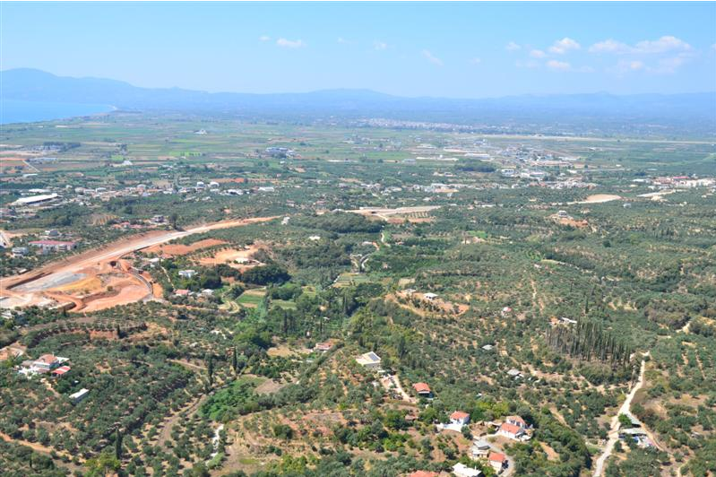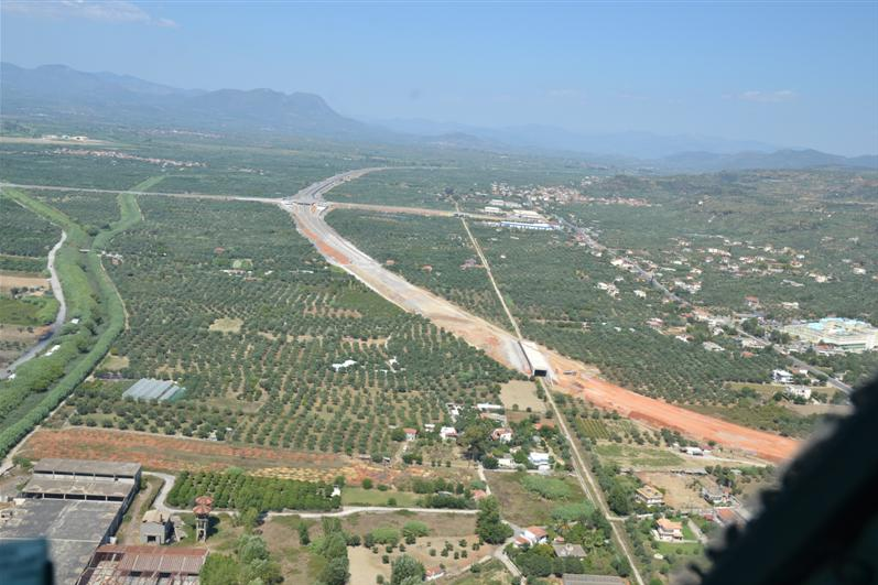 Στην πρώτη αεροφωτογραφία, που παρουσιάζει την πρόοδο των εργασιών από σημείο νοτίως της Σπερχογείας, φαίνεται η διαδρομή του υπό κατασκευήν αυτοκινητοδρόμου προς ανατολάς. Η ευθεία γραμμή στην κατεύθυνση βορρά – νότου είναι η σιδηροδρομική γραμμή, πάνω από την οποία έχει κατασκευασθεί τεχνικό, ώστε να διέρχεται ο αυτοκινητόδρομος (άνω διάβαση). Στο δεξί άκρο της φωτογραφίας, μπορεί κανείς να δει το Νοσοκομείο Καλαμάτας.