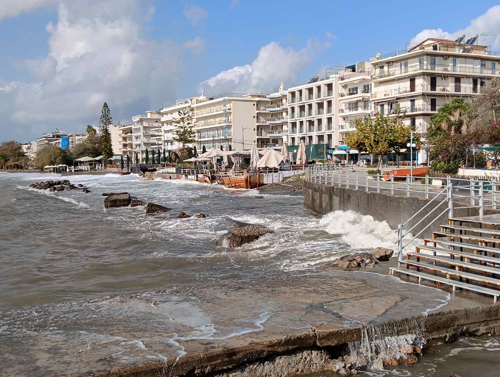 Όμως προκάλεσαν και ζημιές σε υπαίθριες καλοκαιρινές κατασκευές καταστημάτων μέσα στον προλιμένα, όπου η ένταση περιορίζεται.