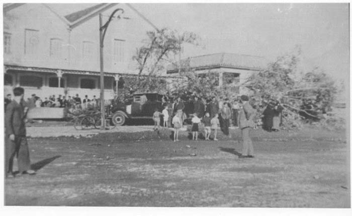 01. Οι καλαματιανοί με πρώτους τους πιτσιρικάδες, περιεργάζονται τροχαίο ατύχημα με θέμα τα δέντρα, κάπου στα μέσα της δεκαετίας του 1930, έξω από το κτήριο του ΑΣΟ στο λιμάνι.