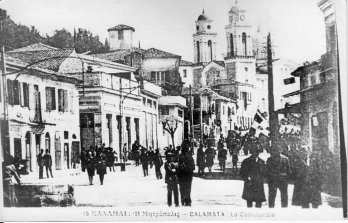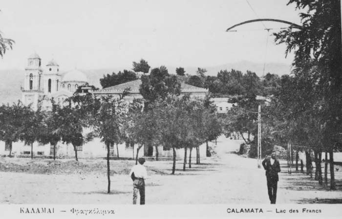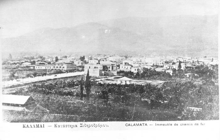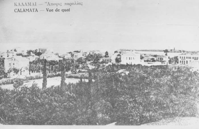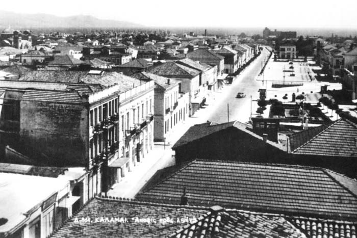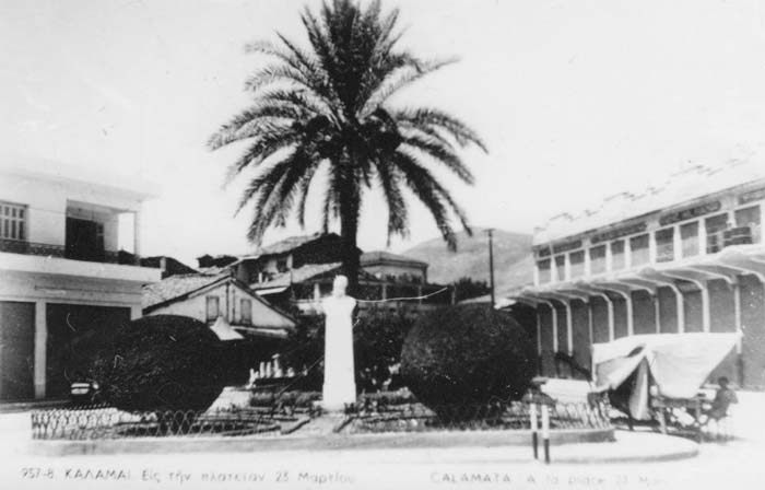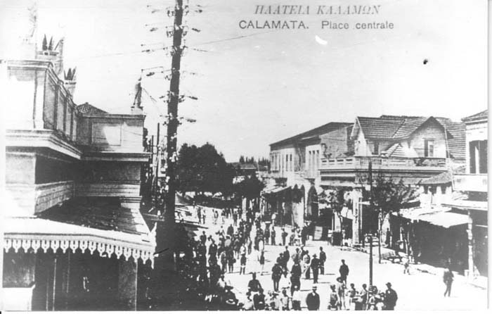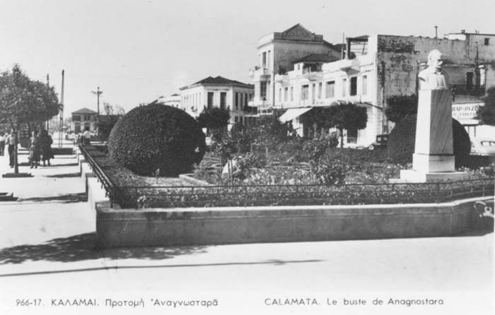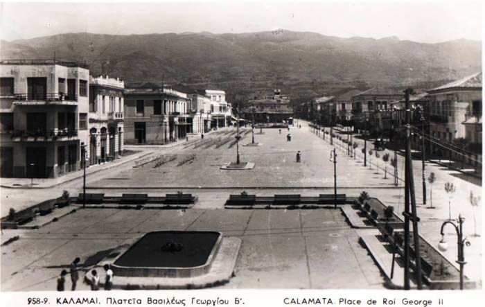 61. Η κεντρική πλατεία της Καλαμάτας από βορά προς νότο, μάλλον τη δεκαετία του 1950. Αριστερά το κτήριο Βαρβουτσή και δίπλα το περίφημο κτήριο Κατσαούνη που κατεδαφίστηκε για να κατασκευαστεί το σημερινό τσιμεντοκούτι της Εθνικής Τράπεζας. Πιο κάτω η Τράπεζα Ελλάδος και στο βάθος οι Ταξιάρχες. Το φουγάρο αριστερά του δρόμου από τα υπολείμματα του Ζαν και Ρος (βιομηχανία Οίνων και Οινοπνευμάτων) και δεξιά οι μύλοι. Από πάνω προς τα κάτω τα παρτέρια με τις αντικρυστές προτομές Παπαφλέσσα και Αναγνωσταρά και μια τριγωνική πλατεία μπροστά από το Τριανόν ως συνέχεια του κτηρίου. Η Σιδηροδρομικού Σταθμού έφθανε απέναντι από τη Λαϊκή Σχολή που φαίνεται κάπου στο κέντρο της φωτογραφίας. Ενα και μοναδικό αυτοκίνητο, παίρνει τη στροφή προς το σταθμό.