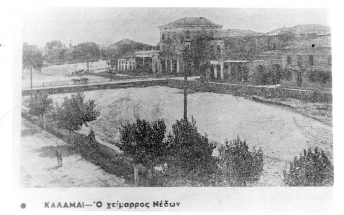 78. Ο Νέδοντας έπνιξε κυριολεκτικά την Καλαμάτα στις 16 Οκτωβρίου 1924. Η οδός Κολοκοτρώνη από τα σκαλιά του Αγίου Νικολάου μοιάζει με λίμνη. Για τον προσανατολισμό θα πρέπει να ληφθεί υπόψη ότι το κτήριο δεξιά από το δέντρο είναι το σημερινό διατηρητέο Αλειφέρη στη βορειοανατολική γωνία της συμβολής της Κολοκοτρώνη με την Αριστομένους.