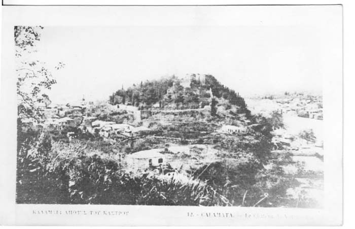 95. Το Κάστρο της Καλαμάτας κάπου στη δεκαετία του 1960, όπως φαινόταν από τη νοτιοδυτική πλευρά. Μια άλλη Καλαμάτα αλλά με ένα ήδη κακοποιημένο μνημείο. Το μαρτυρά το τουριστικό περίπτερο - που διαλύθηκε στη συνέχεια- αλλά δεν ήταν και η πρώτη βίαιη επέμβαση. Η ιστορία του είναι κρυμμένη κάτω από τις ρίζες των πεύκων που φυτεύτηκαν στις αρχές του 20ου αιώνα από τον τότε Νομάρχη και γνωστό λογοτέχνη Ζαχαρία Παπαντωνίου. Λίγα χρόνια αργότερα άρχισε να χτίζεται η εκκλησία του Ευαγγελισμού, σαν να μην έφταναν τόσες και τόσες που υπήρχαν (και υπάρχουν) στην πόλη. Ο αγωγός νερού και η δεξαμενή ύδρευσης ολοκλήρωσαν τις προπολεμικές καταστροφές στο μνημείο που είχε την ατυχία να βρίσκεται στο ψηλότερο σημείο της πόλης. Τα νεότερα χρόνια τόννοι τσιμέντου χρησιμοποιήθηκαν για να κατασκευαστεί το αμφιθέατρο - λες και δεν υπήρχε άλλος τόπος - και ως "κορωνίδα" ασέβειας ξεφύτρωσε το τουριστικό περίπτερο ως εμπορική επιχείρηση. Από τότε έγιναν ελάχιστες σωστικές επεμβάσεις και με το σταγονόμετρο. Το σχέδιο σωτηρίας πλέον είναι πολυδάπανο, κανένας δεν ασχολείται με αυτό και ας ελπίσουμε ότι δεν θα έρθουν τα χειρότερα για ένα μνημείο που θα έπρεπε να είναι σύμβολο της πόλης.