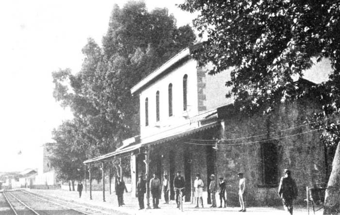 75. Η Σιδηροδρομικού Σταθμού με φόντο το κτήριο του σταθμού και μεταφορικό μέσο το δίτροχο κάρο του αγωγιάτη.