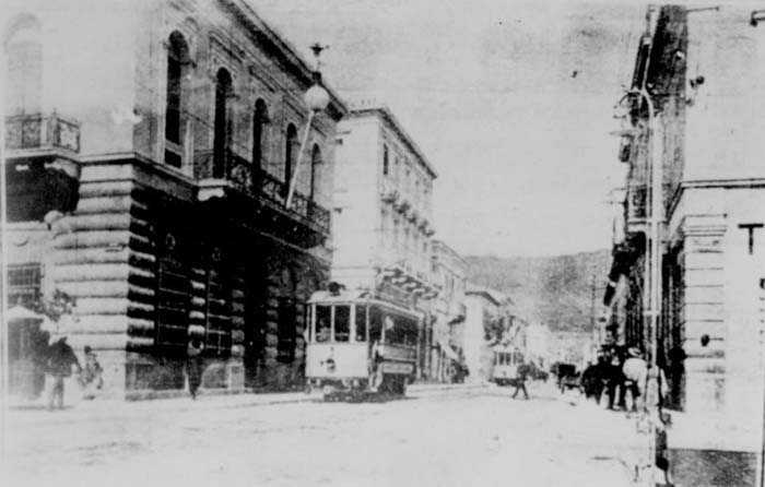 88. Το Δημαρχείο με δύο τραμ να κινούνται επί της Αριστομένους, φωτογραφία της εποχής του μεσοπόλεμου.