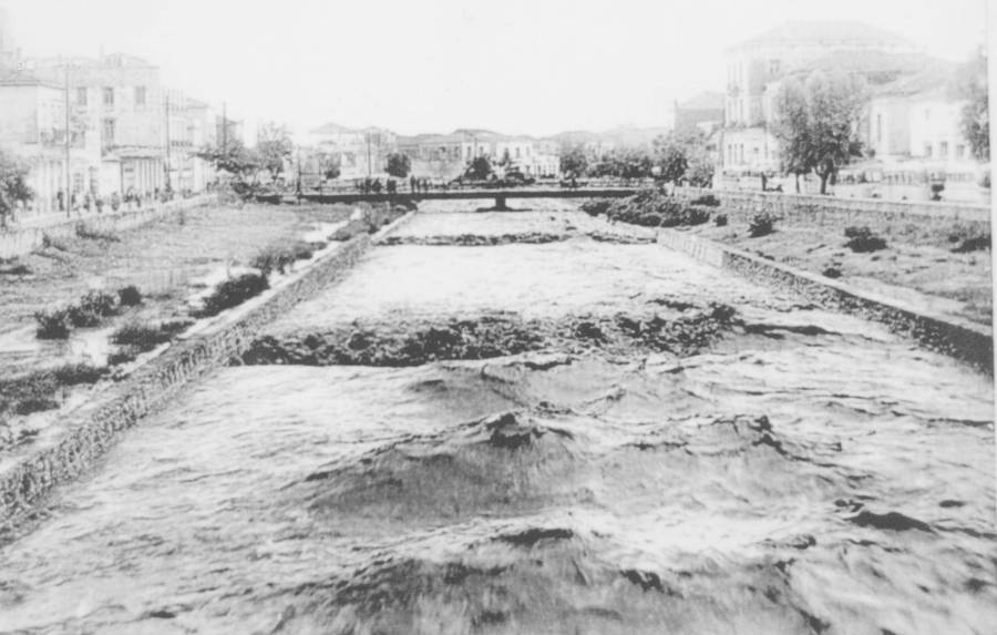 Μια φωτογραφία του από το 1950, θυμίζει καταστροφές που έχει (ή μπορεί να) προκαλέσει. Ορμητικά τα νερά με κυματισμό και ταχύτητα κατευθύνονται προς τη θάλασσα έτοιμα να ανέβουν στη δεύτερη ζώνη απορροής. Στο βάθος η γέφυρα του παλιού ΚΤΕΛ και πίσω από αυτή τα κτίσματα στο ύψος της γέφυρας του ΚΤΕΛ όπου το ποτάμι έπαιρνε στροφή (στη συμβολή Αρτέμιδος και Κιλκίς). Η κοίτη έχει κατασκευαστεί τεχνητά με εκβάθυνση και σκοπό να αφήσει χώρο για λιμάνι και παραλιακό μέτωπο της πόλης.