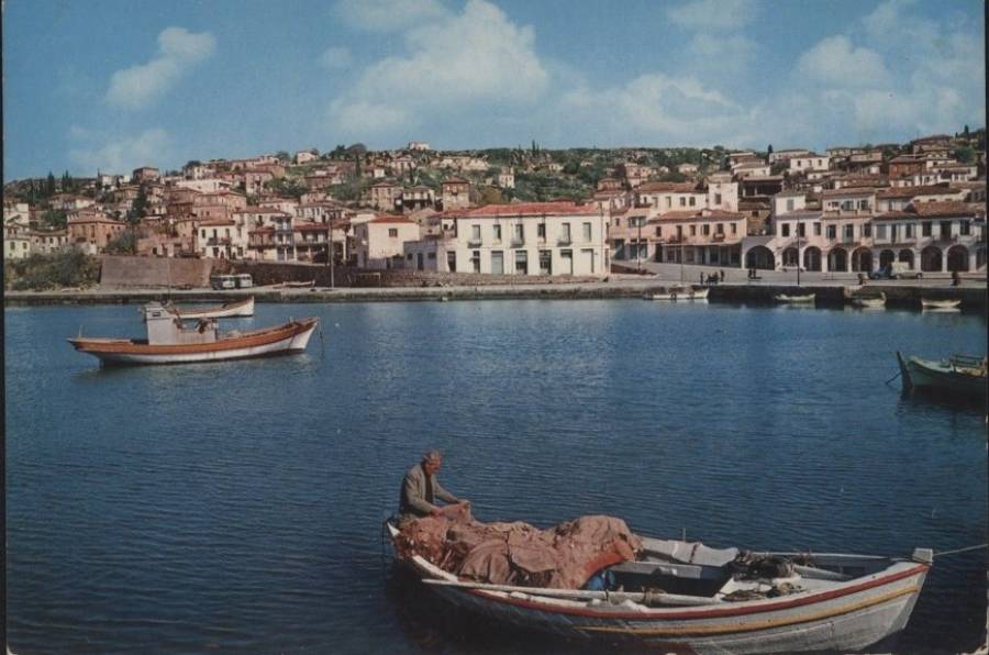 Εντυπωσιακή εικόνα της Πύλου από τη δεκαετία του 1960, με χρώμα γαλήνης. Ψαροκάικα και απέναντι η είσοδος της πόλης από την πλευρά της Καλαμάτας.