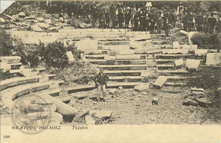 Η φωτογραφία είναι του 1900 και απαθανατίζει επισκέπτες στο «Θέατρο Ιθώμης» κατά την καρτ ποστάλ εποχής.