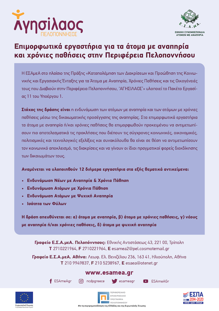 Πρόγραμμα "Αγησίλαος" - Επιμορφωτικά εργαστήρια για άτομα με αναπηρία και χρόνιες παθήσεις στην Περιφέρεια Πελοποννήσου