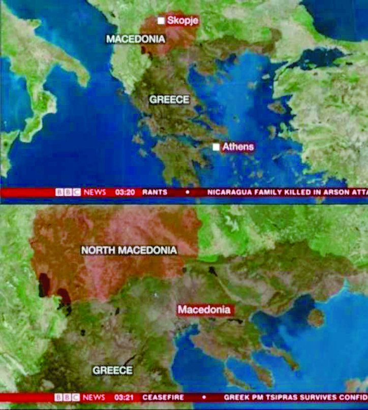 Στον χάρτη το BBC αναγράφει τη πΓΔΜ ως «Μακεδονία», όπως είχε αναγνωριστεί από πλειάδα κρατών (και όχι ως FYROM), ενώ στον κάτω χάρτη την αναφέρει ως North Makedonia (Βόρεια Μακεδονία), ενώ δεν παραλείπει να αναγράψει και τη γεωγραφική περιοχή Μακεδονία της Ελλάδας