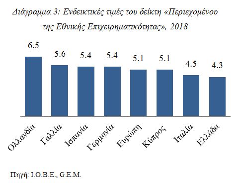 Σε παρόμοια συμπεράσματα οδηγείται και το Ιδρυμα Οικονομικών και Βιομηχανικών Ερευνών (Ι.Ο.Β.Ε.), όπου σε συνεργασία με το Παγκόσμιο Παρατηρητήριο Επιχειρηματικότητας (Global Entrepreneurship Monitor - G.E.M.) διαμόρφωσε φέτος για πρώτη χρονιά τον «Δείκτη περιεχομένου της εθνικής επιχειρηματικότητας» (National Entrepreneurship Context Index - NECI). Στη σχετική μελέτη του, το ΙΟΒΕ έλαβε υπόψη βασικές διαστάσεις της επιχειρηματικότητας, όπως η χρηματοδοτική υποστήριξη, οι κυβερνητικές πολιτικές και προγράμματα για την επιχειρηματικότητα, η μεταφορά έρευνας και ανάπτυξης, η εκπαίδευση και κατάρτιση, οι εμπορικές και επαγγελματικές υποδομές, η εσωτερική αγορά, η πρόσβαση σε υλική υποδομή και τα πολιτισμικά και κοινωνικά πρότυπα.