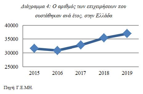 Παρά τις αντίξοες συνθήκες όμως, οι Ελληνες επιχειρηματίες δεν φαίνεται να είναι διατεθειμένοι να τα παρατήσουν. Οι συστάσεις νέων εταιρειών, όπως αυτές καταγράφονται από το Γενικό Εμπορικό Μητρώο (Γ.Ε.ΜΗ.), εμφανίστηκαν αυξημένες για τρίτη συνεχόμενη χρονιά από το 2016. Συγκεκριμένα, οι εταιρείες όλων των νομικών μορφών που καταχωρίσθηκαν στο Γ.Ε.ΜΗ. το 2019 ήταν 36.964 (Διάγραμμα 4).