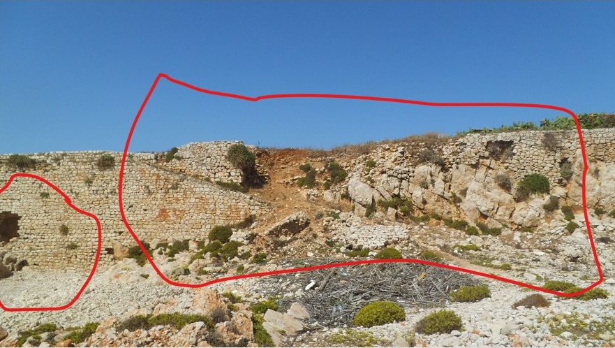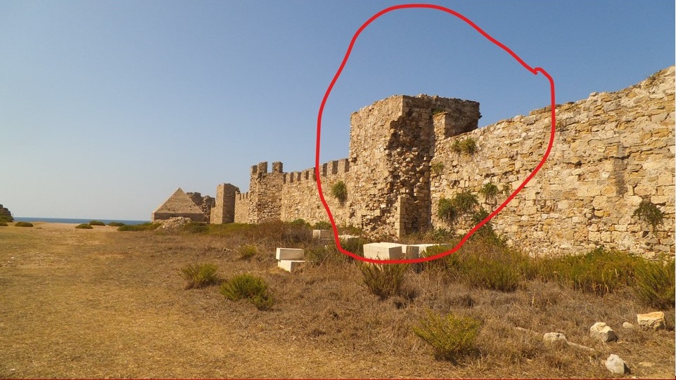 Αεροφωτογραφία του βραβευμένου κάστρου με επισημασμένες τις καταρρεύσεις στο δυτικό τείχος και τη βάση του Μπούρτζι