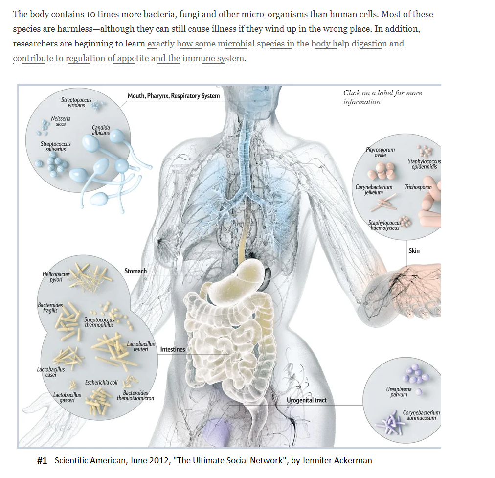 Αξίζει λοιπόν να γίνει αναφορά στα “καλά” βακτήρια του εντέρου, αλλά και γενικότερα στους – άγνωστους – “συμβιωτικούς οργανισμούς” του σώματος του ανθρώπου και των άλλων ζώων (Διαγράμματα #1 & #2).