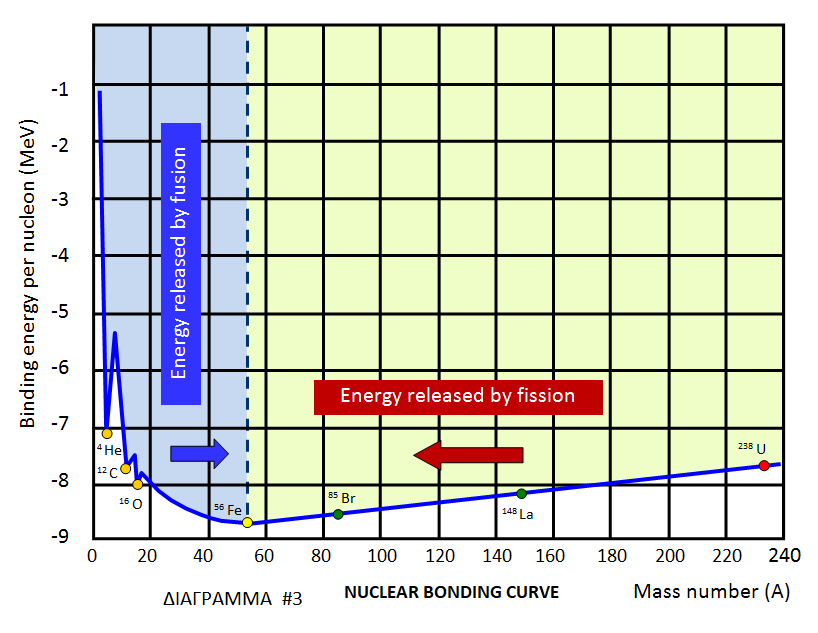Όπως φαίνεται στο Διάγραμμα #3, Η διαδικασία της Σύντηξης αποδίδει ενέργεια στη “μετάβαση” από Υδρογόνο σε Σίδηρο, ενώ για τη “μετάβαση” από Ουράνιο προς Σίδηρο αποδίδεται ενέργεια μέσω Σχάσης. Αυτό συμβαίνει γιατί η ενέργεια σύνδεσης ανά νουκλεόνιο στον πυρήνα του σιδήρου είναι μικρότερη από τα ελαφρότερα και από τα βαρύτερα άτομα, οπότε ο σίδηρος είναι πιο ευσταθής από τα υπόλοιπα άτομα. Η ενέργεια ανά νουκλεόνιο στους πυρήνες των ατόμων μειώνεται και από τις δύο κατευθύνσεις προς τον πυρήνα του σιδήρου. Σε κάθε “βήμα” προς τον σίδηρο, είτε με σύντηξη ελαφρότερων πυρήνων, είτε με σχάση βαρύτερων πυρήνων, δημιουργείται μιά “απώλεια μάζας” (mass defect) που μετατρέπεται σε ενέργεια (E = m * c2). Αυτό αντιστοιχεί στη διαφορά μάζας ανάμεσα στον πυρήνα ενός ατόμου και στα ελεύθερα νουκλεόνια (πρωτόνια και νετρόνια) που τον συνθέτουν.[σ.σ.]