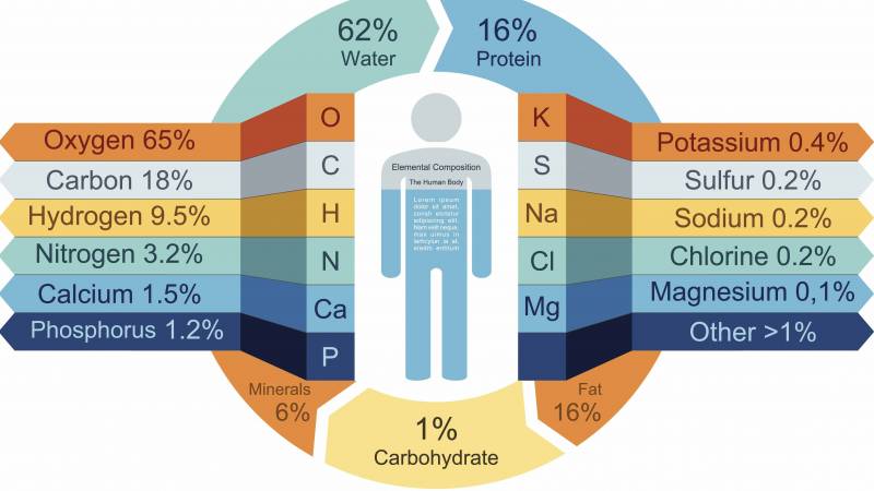 Ανά Ατομικό Στοιχείο : Οξυγόνο 65%, Άνθρακας 18%, Υδρογόνο 9,5%, Άζωτο 3,2%, Ασβέστιο 1,5%, Φώσφορος 1,2% και σε μικρότερες ποσότητες : Κάλιο, Θείο, Νάτριο, Χλώριο, Μαγνήσιο.