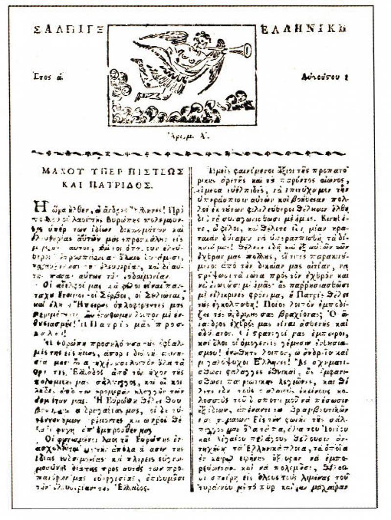 Το Ιούλιο του 1821, το πιεστήριο του Υψηλάντη μεταφέρθηκε στην Καλαμάτα, όπου ιδρύθηκε το πρώτο τυπογραφείο στην επαναστατημένη Ελλάδα, καθώς η πόλη θεωρούταν το πιο ασφαλές μέρος. Στις 30 Ιουλίου 1821 τυπώθηκαν στην Καλαμάτα οι «Νόμοι Στρατιωτικοί» και ο «Όρκος» του Αλέξανδρου Υψηλάντη, ενώ την 1η Αυγούστου 1821 εκδίδεται η πρώτη έντυπη εφημερίδα του Αγώνα, η «Σαλπιγξ Ελληνική». Συντάκτης της εφημερίδας ήταν ο Θεόκλητος Φαρμακίδης και τυπογράφος ο Τόμπρας. Η εφημερίδα κυκλοφόρησε συνολικά τρία φύλλα: την 1η, την 5η και την 20ή Αυγούστου 1821. Ωστόσο, η έκδοσή της δεν θα συνεχιστεί, καθώς οι διαμάχες του Φαρμακίδη με τον Δημ. Υψηλάντη θα οδηγήσουν στη διακοπή της. Επίσης, στο τυπογραφείο Καλαμάτας τυπώθηκε η «Ωδή Πολεμιστήριος» (Ιούλιος ή Αύγουστος 1821) καθώς και το έγγραφο «Δια προσταγής του Υψηλοτάτου Πρίγκηπος Δημητρίου Υψηλάντου πληρεξούσιου» (1η Σεπτεμβρίου 1821).