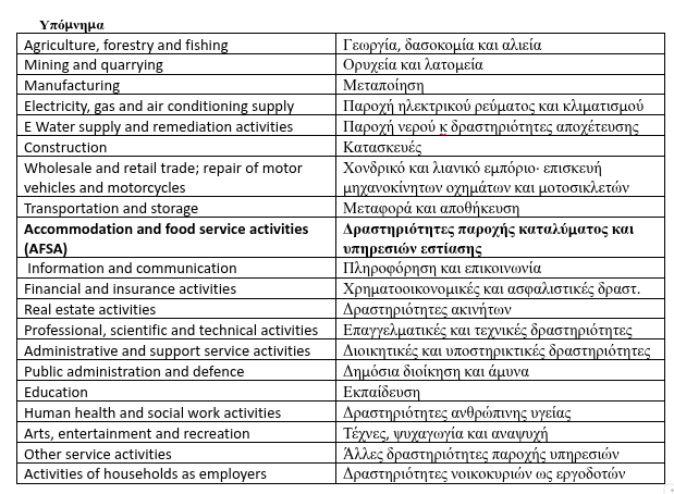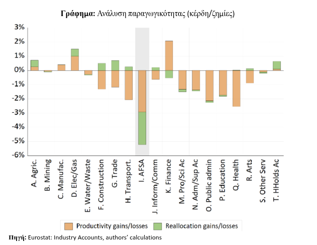 Στο πιο κάτω γράφημα γίνεται η ανάλυση παραγωγικότητας με κέρδη και ζημίες ανά τομέα δραστηριότητας. Όπως προκύπτει οι περισσότεροι τομείς παρουσίασαν απώλειες παραγωγικότητας. Ειδικότερα ο τομέας AFSA, δλδ οι «δραστηριότητες παροχής καταλύματος και υπηρεσιών εστίασης», παρουσίασε τις μεγαλύτερες απώλειες παραγωγικότητας από όλους τους υπόλοιπους.