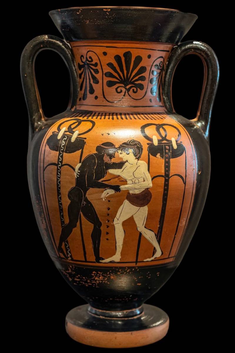 (Στη φωτογραφία: Αττικός μελανόμορφος αμφορέας, 18,3 εκατ. Σκηνή πάλης, πιθανότατα μεταξύ του Πηλέα, γιου του βασιλιά της Αίγινας, Αιακού και της Αταλάντης. 500 π.Χ. Μητροπολιτικό Μουσείο Τέχνης της Νέας Υόρκης.
