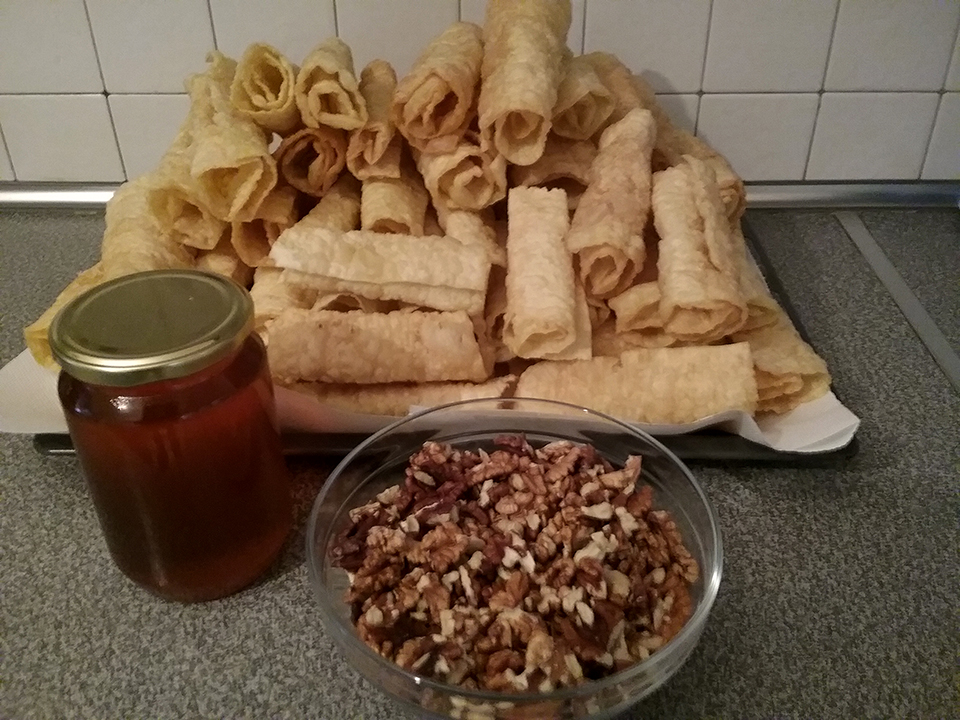 Για το σερβίρισμα: 1 1/2 κιλό μέλι, 2 κούπες νερό, κανέλα, καρύδια τριμμένα, μισό λεμόνι για το σιρόπι.