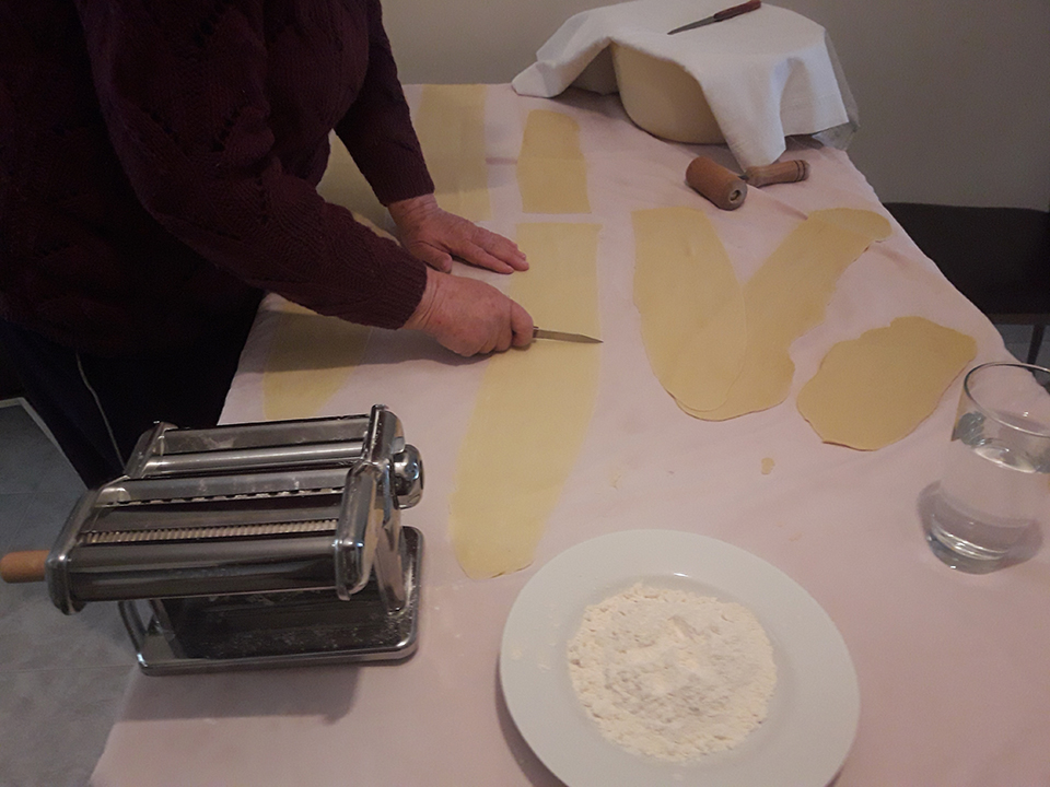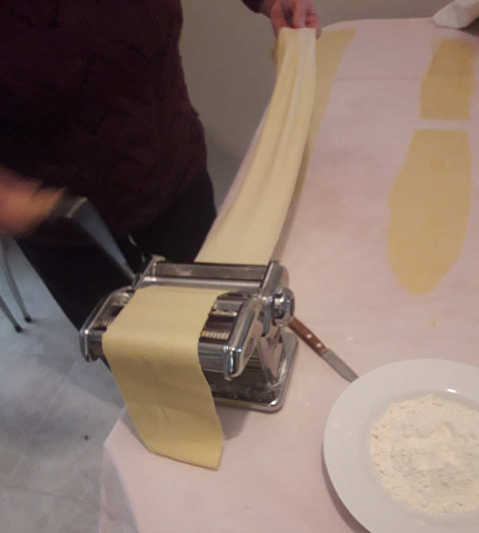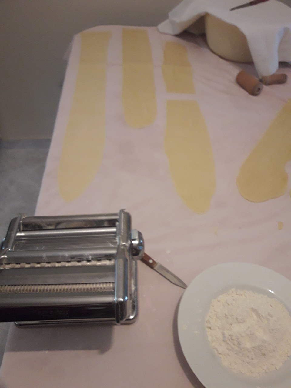 Όταν η ζύμη είναι έτοιμη, ανοίγουμε το κάθε μπαλάκι με τα χέρια μας σε χοντρά, μακρόστενα φύλλα. Περνάμε το φύλλο μέσα από τη μηχανή, ρυθμίζοντάς τη στην πρώτη σκάλα, που είναι για τα χοντρά φύλλα. Την περνάμε μια ή δυο φορές και μετά ρυθμίζουμε τη μηχανή σε λεπτότερο πάχος. Μπορεί να χρειαστεί να πασπαλίσουμε με λίγο αλεύρι για να μην κολλήσει. Το πάχος στο τέλος δεν θα πρέπει να ξεπερνά τα 3 χιλιοστά για να είναι τραγανή και να μην ρουφήξει πολύ λάδι στο τηγάνισμα. Αρχίζουμε να κόβουμε τη λωρίδα ανά 10-12 εκατοστά και πασπαλίζουμε με ελάχιστο αλεύρι για να μην κολλήσουν. Σκεπάζουμε την ζύμη με πετσέτα για να μην ξεραθεί.