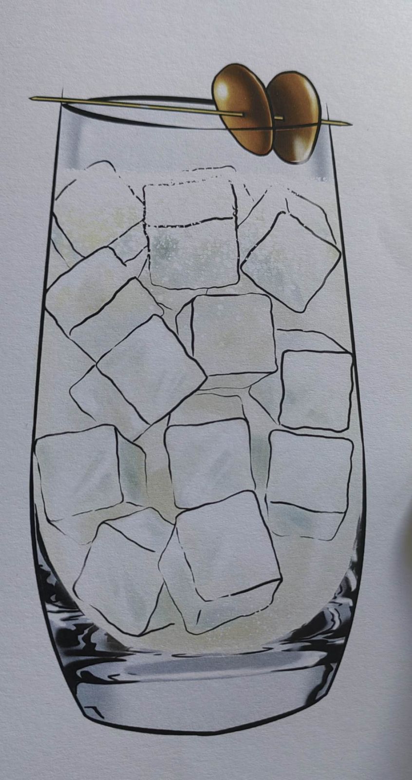 Γεμίζουμε το ποτήρι με πάγο μέχρι πάνω και απογεμίζουμε με την soda, αποφεύγοντας να τη ρίξουμε πάνω σε κάποιο παγάκι για να μην καταστρέψουμε το ανθρακικό. Ανακατεύουμε ελαφρώς. Προσθέτουμε και άλλο πάγο αν χρειαστεί. Γαρνίρουμε με μια ελιά.