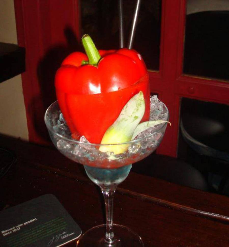 "Red hot chili peppers". Μέσα σε μια κόκκινη αδειασμένη φρέσκια πιπεριά, την οποία έχουμε βάλει σε ποτήρι μαργαρίτας, ρίχνουμε: