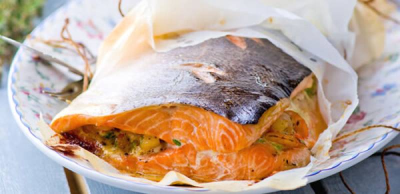 4. Τυλίγετε τα γεμισμένα φιλέτα σφιχτά στη λαδόκολλα και κλείνετε με ένα κομμάτι σπάγκο. Βάζετε τη λαδόκολλα με το σολομό σε ένα ορθογώνιο ταψί και ψηνετε σε προθερμασμένο φούρνο, στους 200 βαθμούς για 20 λεπτά.