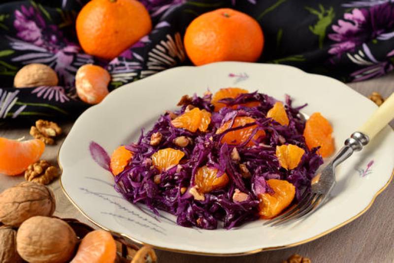 Μοιράζουμε το λάχανο στα πιάτα, προσθέτουμε τα καρύδια και τα μανταρίνια, πασπαλίζουμε με φρεσκοτριμμένο μαύρο πιπέρι και σερβίρουμε.