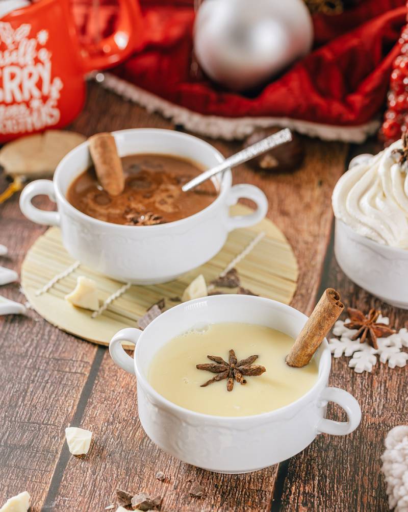 Σε ένα κατσαρολάκι βάζω την κρέμα γάλακτος, το γάλα, την κανέλα, την άχνη και το εκχύλισμα βανίλιας. Βάζω την κατσαρόλα σε χαμηλή φωτιά και αφήνω να βράσει για 2 λεπτά (από τη στιγμή που θα ξεκινήσει ο βρασμός). Αποσύρω από τη φωτιά, πετάω το ξύλο κανέλας και ρίχνω την ψιλοκομμένη λευκή σοκολάτα. Ανακατεύω καλά για να λιώσει και μοιράζω στις κούπες. Σερβίρω με σαντιγί, ξύλο κανέλας και αστεροειδή γλυκάνισο.
