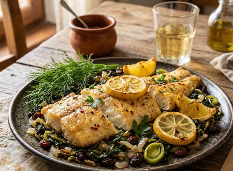 Μπακαλιάρος με άγρια χόρτα στο φούρνο