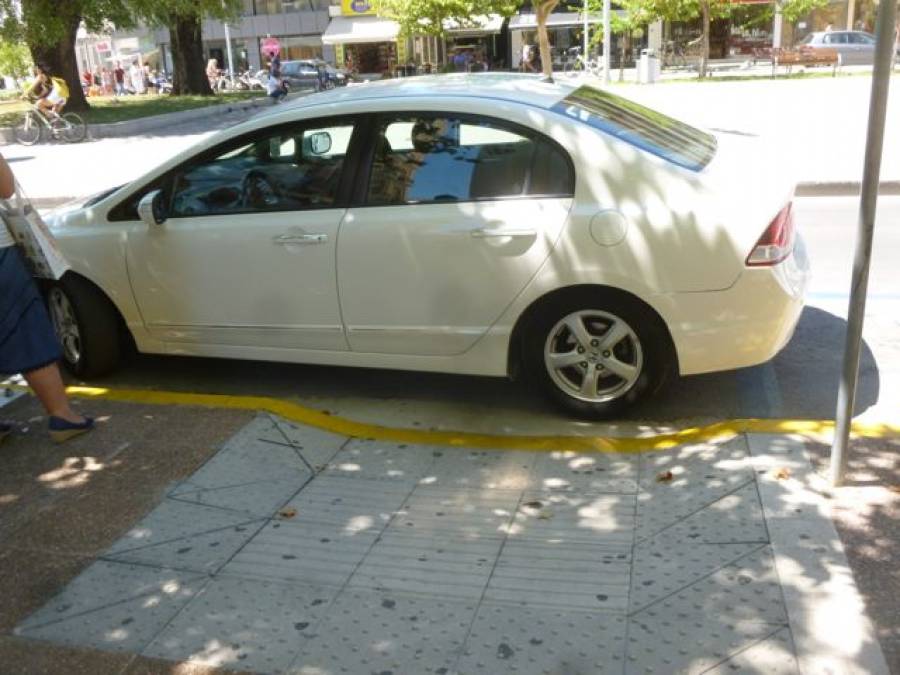 Διάβαση ΑμεΑ κλειστή, κατειλημμένη από αυτοκίνητο το μεσημέρι της Τρίτης, στην Αριστομένους, μπροστά από το Πνευματικό Κέντρο Καλαμάτας, στο πιο κεντρικό σημείο της πόλης.