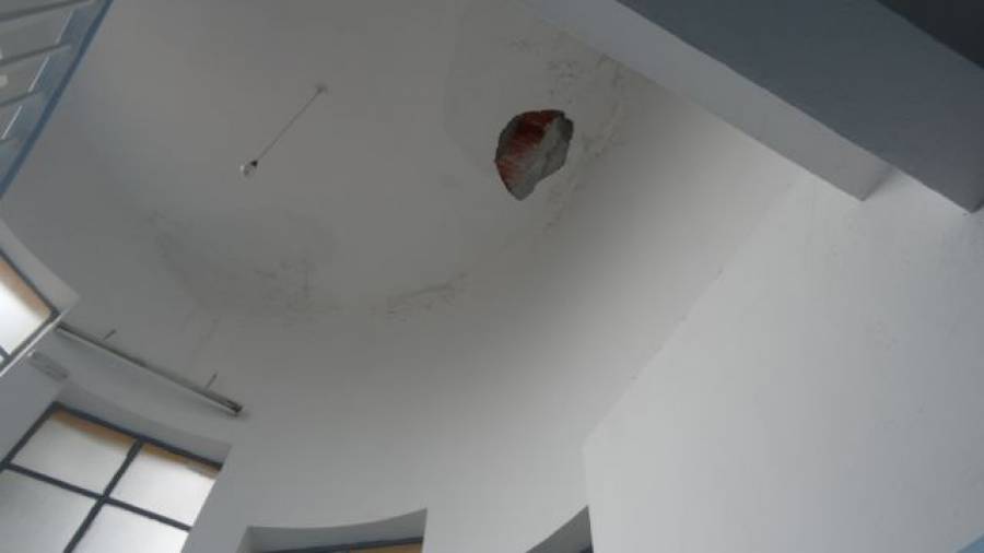 Νερά της βροχής στάζουν στο κλιμακοστάσιο του κτηρίου που στεγάζει το Δημοτικό Λιμενικό Ταμείο Καλαμάτας, από μια… τρύπα στην οροφή.