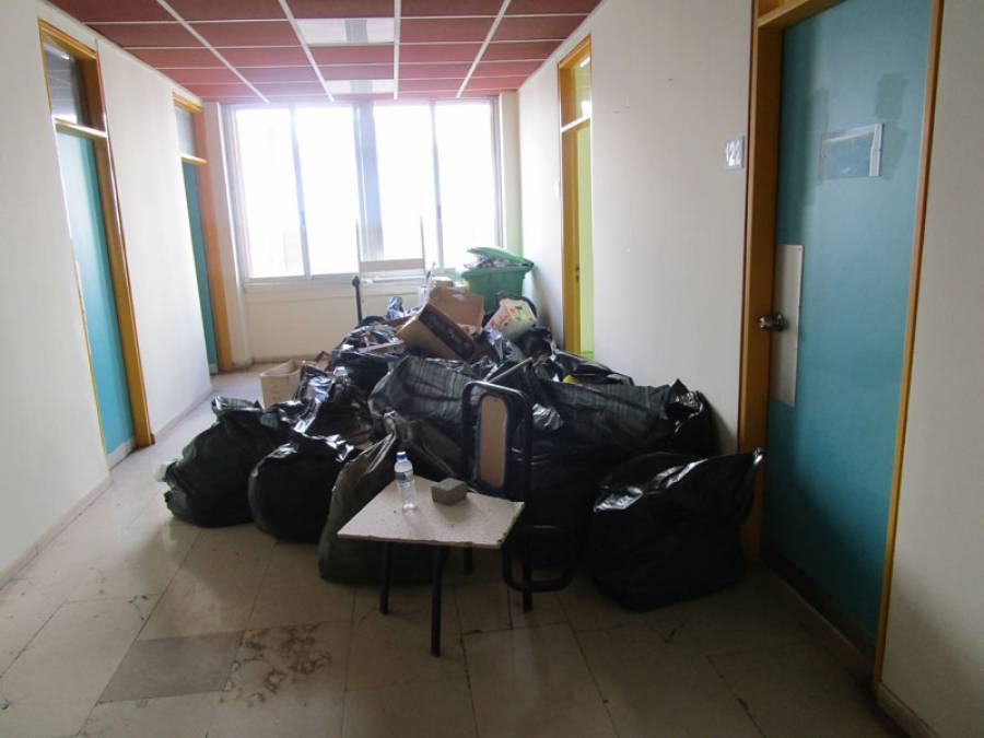 Σακούλες με σκουπίδια έχουν συγκεντρωθεί εδώ και μέρες στον 1ο όροφο του Διοικητηρίου Μεσσηνίας, όπου φιλοξενήθηκαν για 1 - 2 μέρες οι 87 μετανάστες.