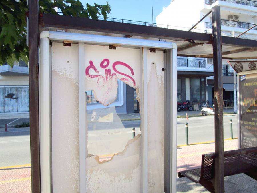 Εικόνα διάλυσης κι εγκατάλειψης εμφανίζουν οι στάσεις του αστικού ΚΤΕΛ στη Ναυαρίνου, στην καρδιά της τουριστικής Καλαμάτας.