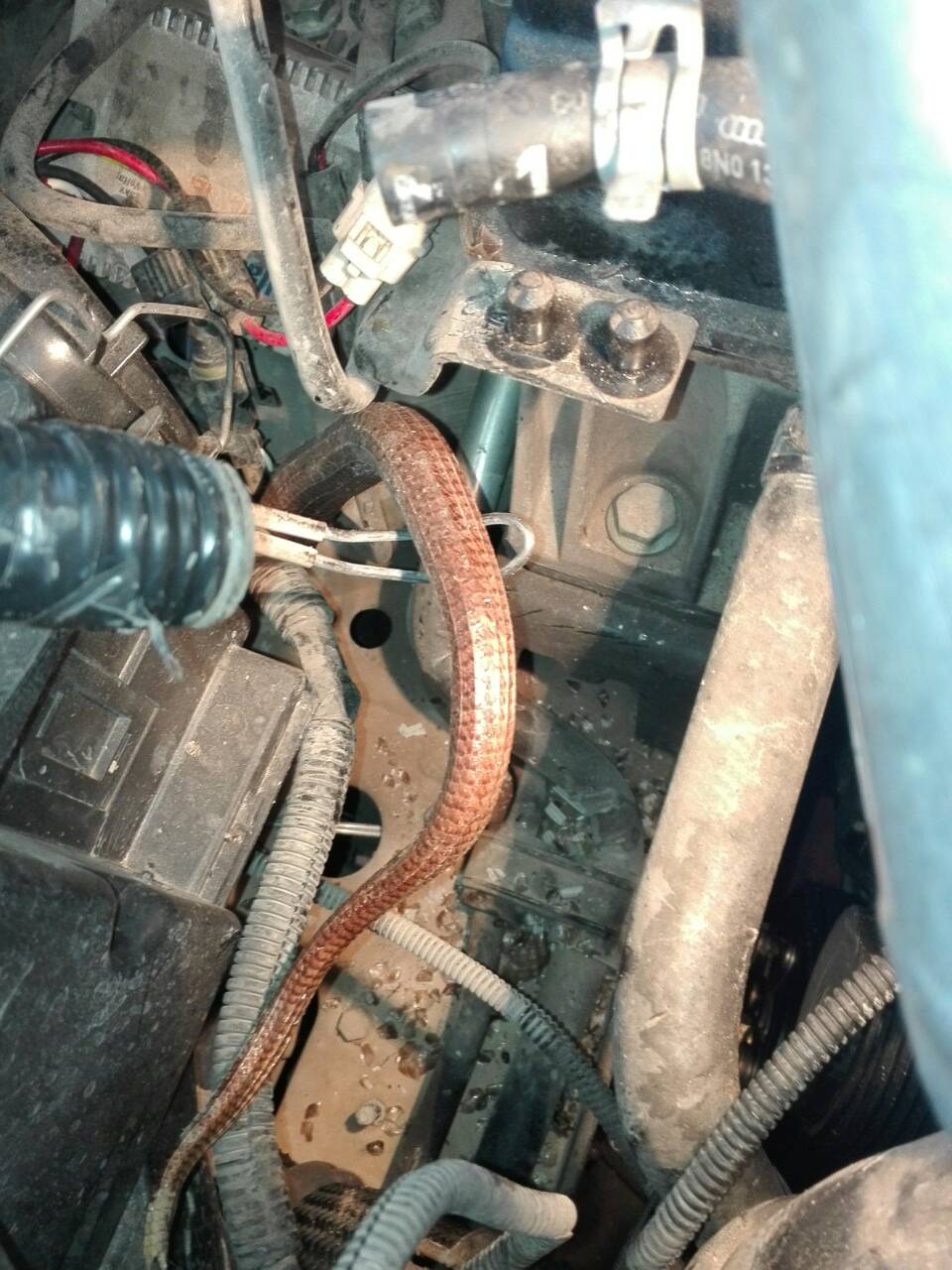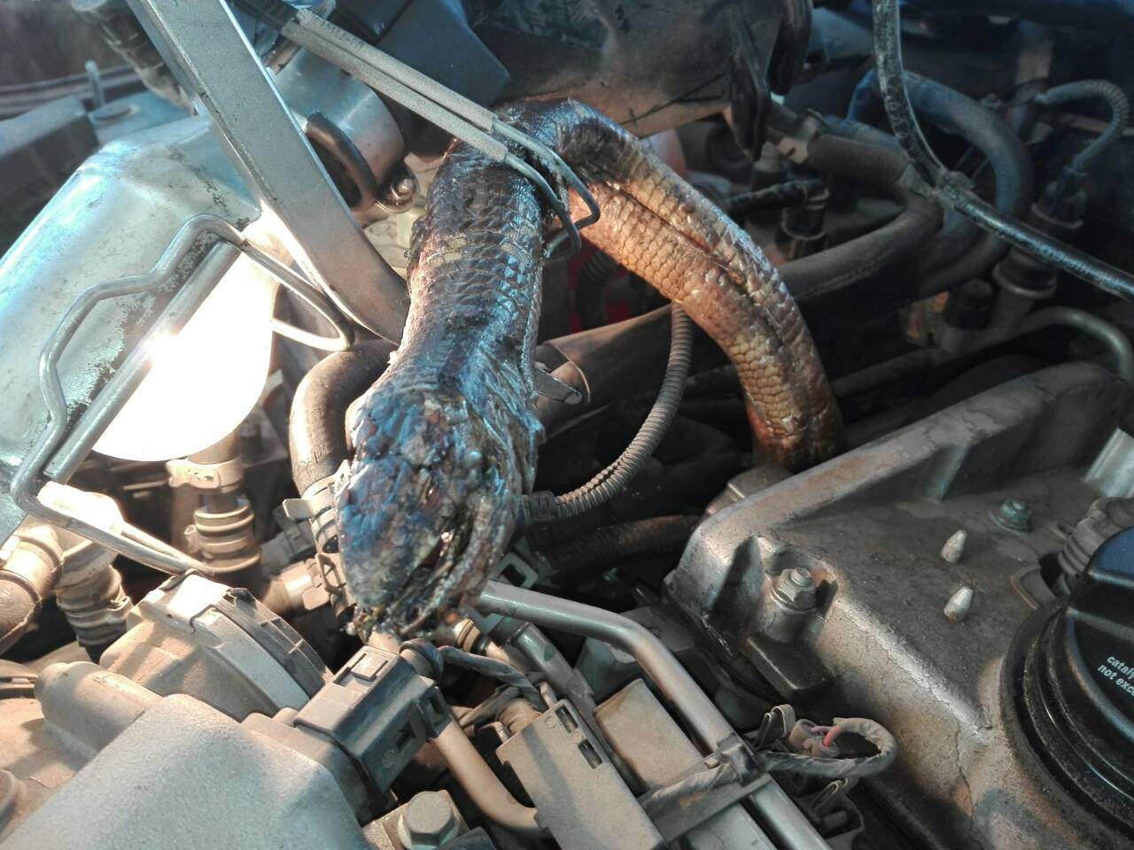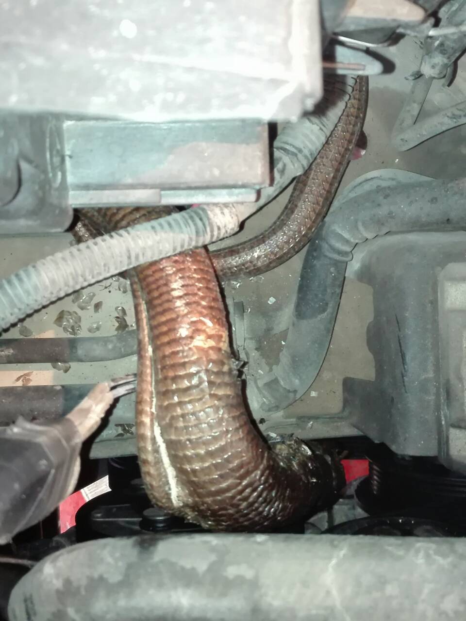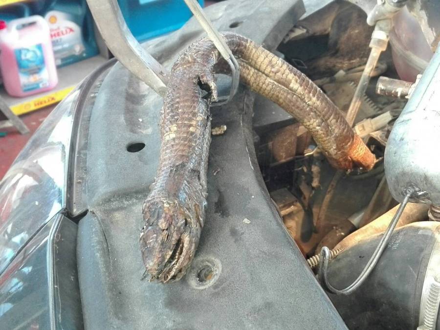 Έκπληκτοι έμειναν οι μηχανικοί στο συνεργείο Καλογερόπουλου στην περιοχή της Αγίας Τριάδας στο θέαμα του ερπετού μέσα στο καπό του αυτοκινήτου. Φυσικά δεν είναι λίγες οι φορές, που κάποιο φίδι ή άλλο ζώο έχει προκαλέσει ζημιά σε όχημα, αλλά σε αυτή την περίπτωση ιδιαίτερη εντύπωση προκαλεί το μέγεθος του φιδιού.