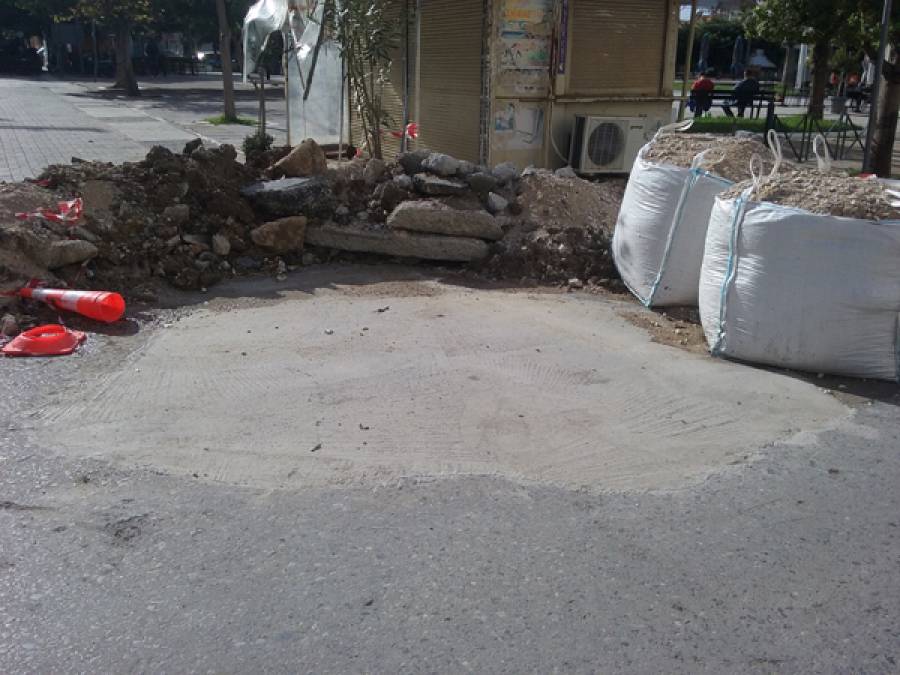 Πρόκειται για έναν σωρό από μπάζα και σάκους με άμμο, που βρίσκονται στην άκρη και πάνω στο δρόμο, απομεινάρια της λακκούβας που έκλεισαν πρόσφατα. Είναι εκεί κάμποσες μέρες τώρα και μάλλον πρόκειται για νέα εικαστική παρέμβαση!