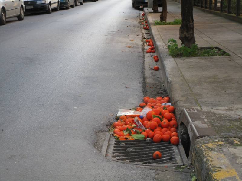 Με την πρώτη βροχή ελπίζουμε να... χωρέσουν στη σχάρα, γιατί διαφορετικά το νερό θα πλημμυρίσει το δρόμο και το πεζοδρόμιο.