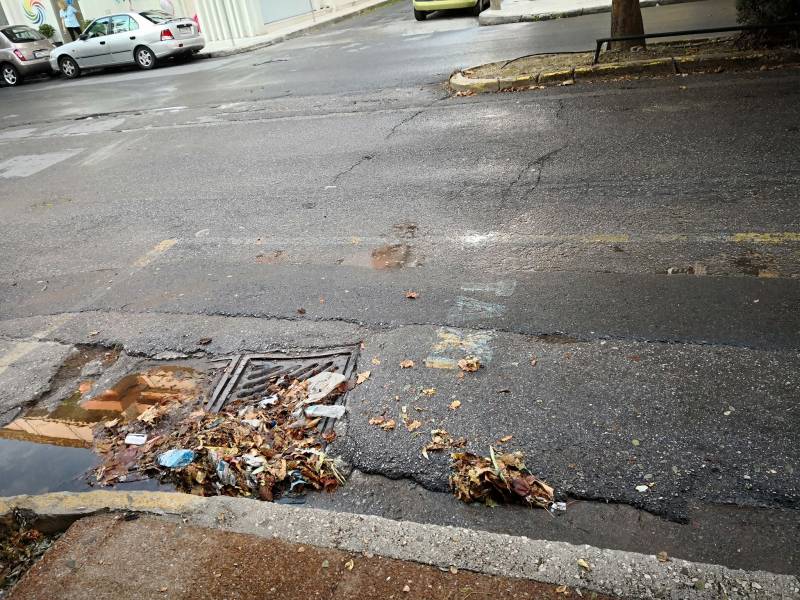 Τα φρεάτια για διάφορους λόγους βουλώνουν ξανά και ξανά, ενώ υπάρχουν σημεία που μοιάζουν να μην έχουν καθαριστεί εδώ και μήνες. Ένα από αυτά βρίσκεται στην οδό Ακρίτα, κοντά στην διασταύρωση με την Ναυαρίνου.