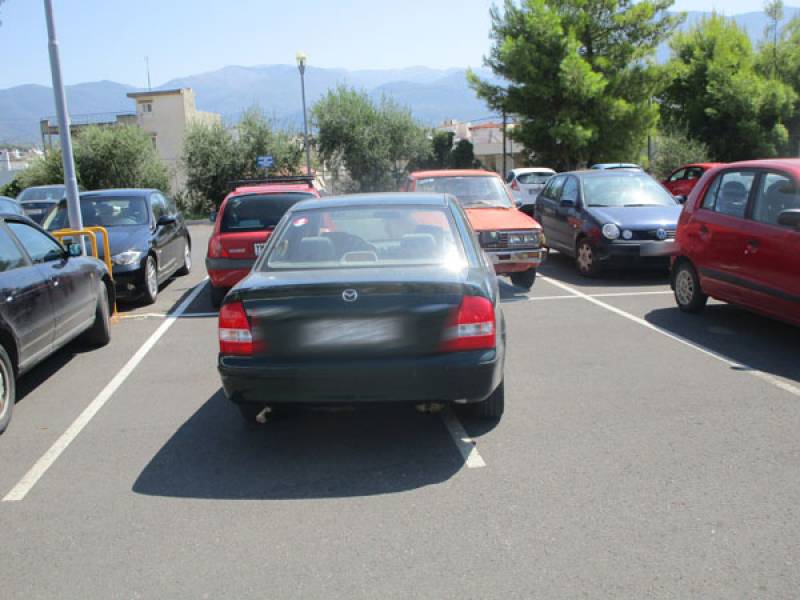 Δύο θέσεις στάθμευσης έχει πιάσει ο οδηγός του συγκεκριμένου αυτοκινήτου στο πάρκινγκ του νέου Δημαρχείου Καλαμάτας, γιατί έτσι τον βόλευε.
