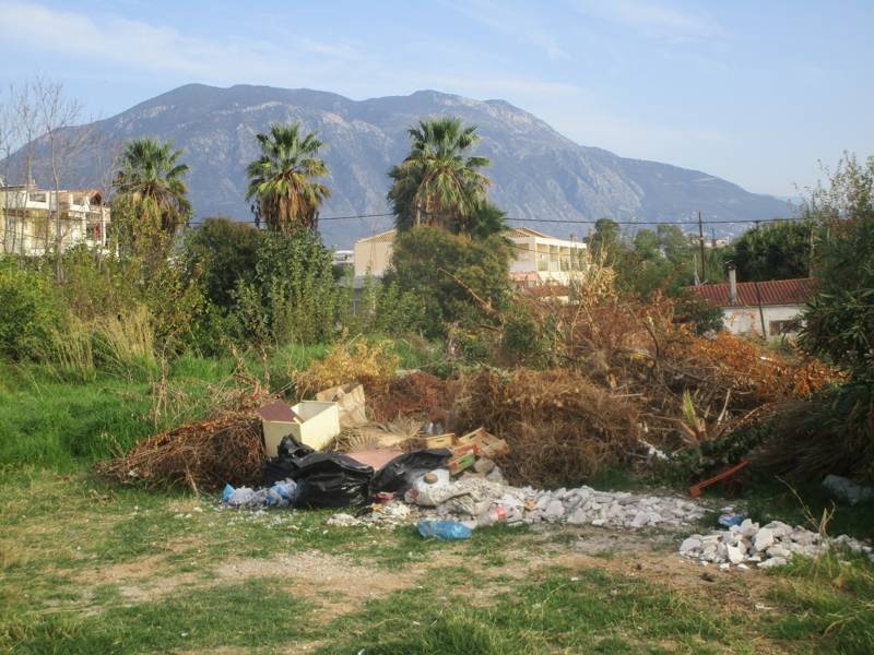 Μαύρες σακούλες και μπάζα προστέθηκαν στα κλαδέματα, σε χορταριασμένο οικόπεδο δίπλα στο χώρο στάθμευσης στην οδό Σχίζας, κοντά στο 9ο Δημοτικό Σχολείο Καλαμάτας.