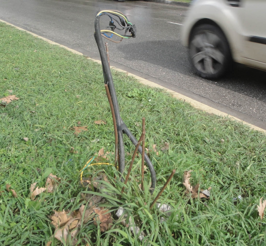 ΕΙΝΑΙ σαφές ότι η κολόνα έπεσε -κυριολεκτικά- θύμα τροχαίου, όμως παραμένουν και τα καλώδια, πρόχειρα τυλιγμένα με μονωτική ταινία, αλλά και οι μπετόβεργες να εξέχουν επικίνδυνα από το γρασίδι της νησίδας.