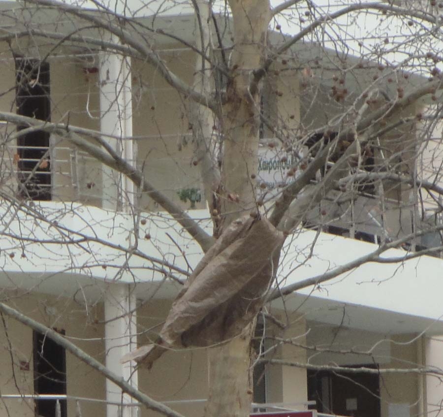 ΤΟ… πήρε και το σήκωσε, στην κυριολεξία, ο δυνατός άνεμος το άδειο σακί, που κατέληξε να κρέμεται από τα κλαριά ενός δέντρου, στο κέντρο της Καλαμάτας.