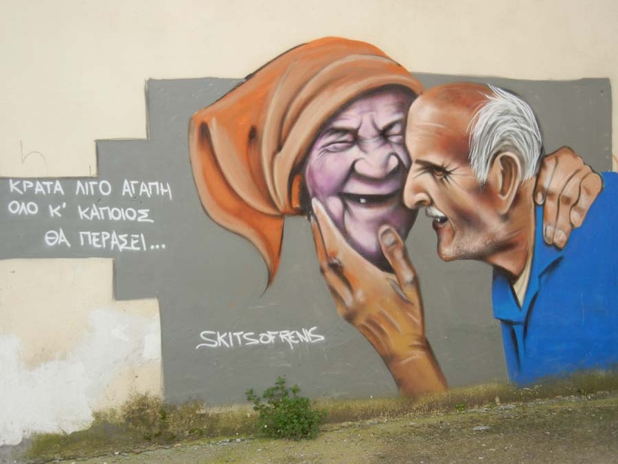 ΔΕΝ δείχνουμε πως σεβόμαστε όσο θα έπρεπε την τρίτη ηλικία οι σημερινοί άνθρωποι. Δεν τους βοηθάμε να περάσουν το δρόμο, δεν προσφερόμαστε να τους κουβαλήσουμε τα ψώνια και άμα έχουμε και νεύρα, ξεσπάμε και πάνω τους χωρίς να φταίνε... Το επίπεδό μας φαίνεται σε μεγάλο βαθμό από το πώς φερόμαστε στους γέροντες που ζουν κοντά μας. Μπράβο στον "Skitsofreni" που για πρώτη φορά απεικόνισε τη γλυκύτητα της τρίτης ηλικίας σε γκράφιτι...