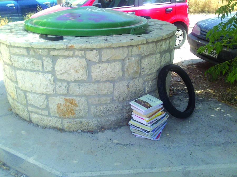 Μετά το τέλος και των ενδοσχολικών μαθημάτων, τα βιβλία αντί να πάνε σε κάποιο ράφι για ενθύμιο, καταλήγουν πια στα σκουπίδια. Τουλάχιστον ο δράστης... ας είχε περιβαλλοντική συνείδηση, τα έβαλε δίπλα στον πέτρινο κάδο και όχι στην ανακύκλωση!
