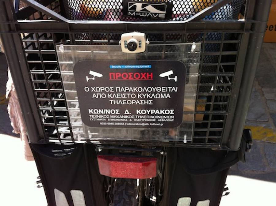 Η προειδοποιητική πλακέτα και η κάμερα που φαίνονται στη φωτογραφία είναι στο πίσω μέρος του καλαθιού... ποδηλάτου! Ο ιδιοκτήτης ξέρει από τεχνολογία και φυσικά... από χιούμορ!